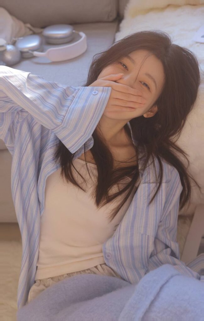 淡妆,上着是粉红色的无袖桃领衬衫,下面配着一件粉红百褶迷你裙,大腿被一